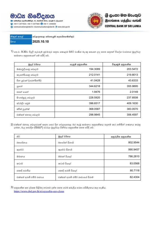 වාණිජ බැංකු විදේශ මුදල් අනුපාත – 10.10.2025