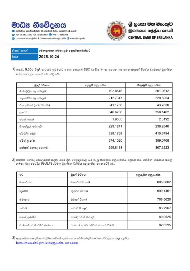 වාණිජ බැංකු විදේශ මුදල් අනුපාත – 24.10.2025