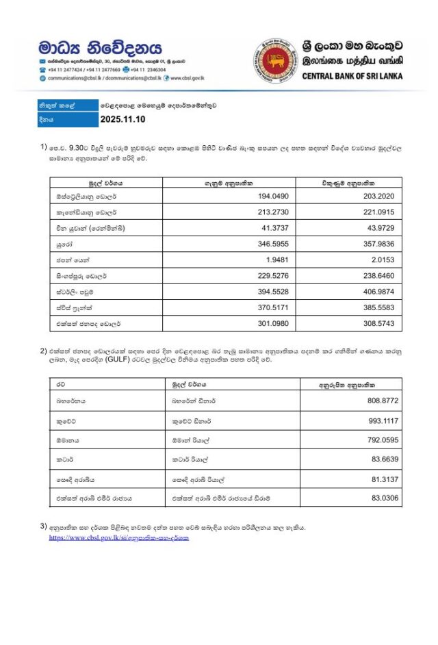 වාණිජ බැංකු විදේශ මුදල් අනුපාත – 10.11.2025