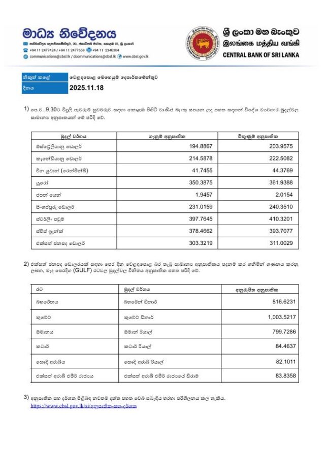 වාණිජ බැංකු විදේශ මුදල් අනුපාත – 18.11.2025