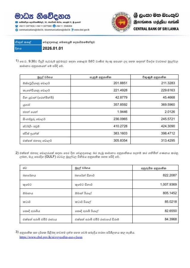 වාණිජ බැංකු විදේශ මුදල් අනුපාත – 01.01.2026