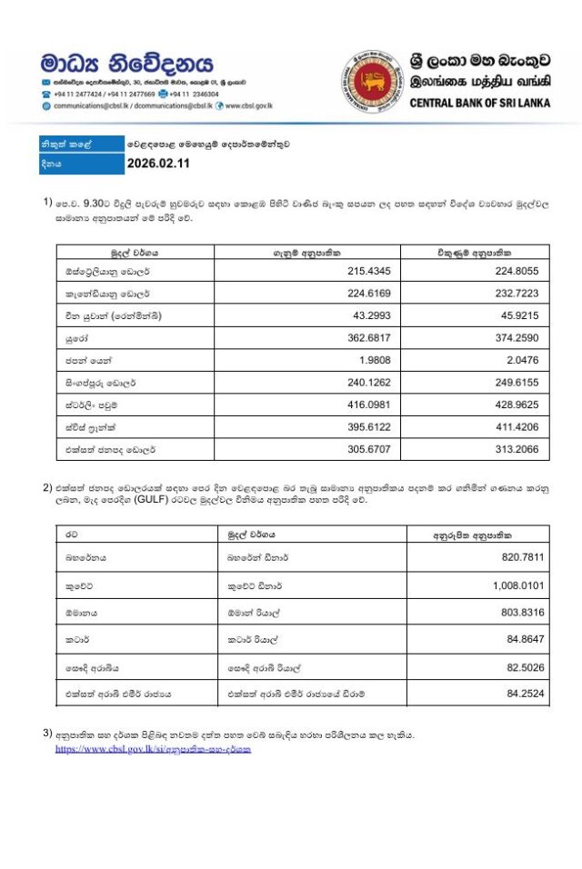 වාණිජ බැංකු විදේශ මුදල් අනුපාත – 11.02.2026