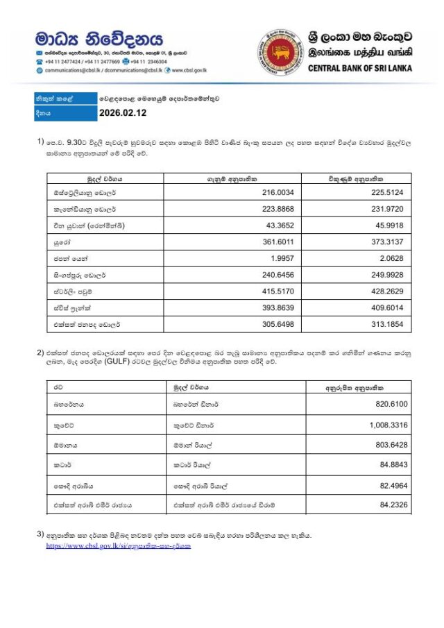 වාණිජ බැංකු විදේශ මුදල් අනුපාත – 12.02.2026