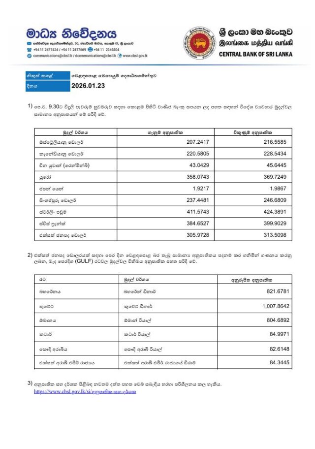 වාණිජ බැංකු විදේශ මුදල් අනුපාත – 23.01.2026